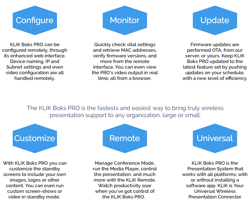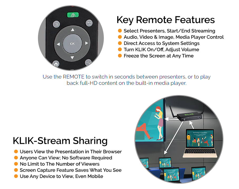 Includes KLIKStream feature, allowing users to see presentation in a browser.