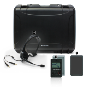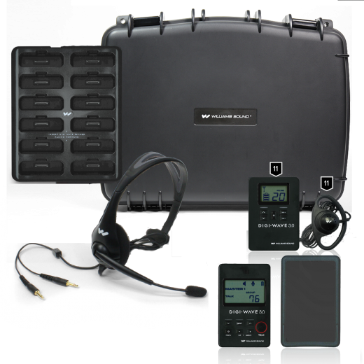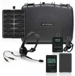 Two-way, wireless tour guide system, 2.4 GHz. Allows two or more tour guides to combine skills and guide as a team to a group. Enhances communication between tour guide and tour group members. (12) DLT 300 transceivers with headsets